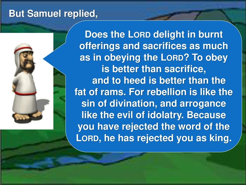 "But Samuel replied: 'Does the Lord delight in burnt offerings and sacrifices as much as in obeying the Lord? To obey is better than sacrifice, and to heed is better than the fat of rams.'"