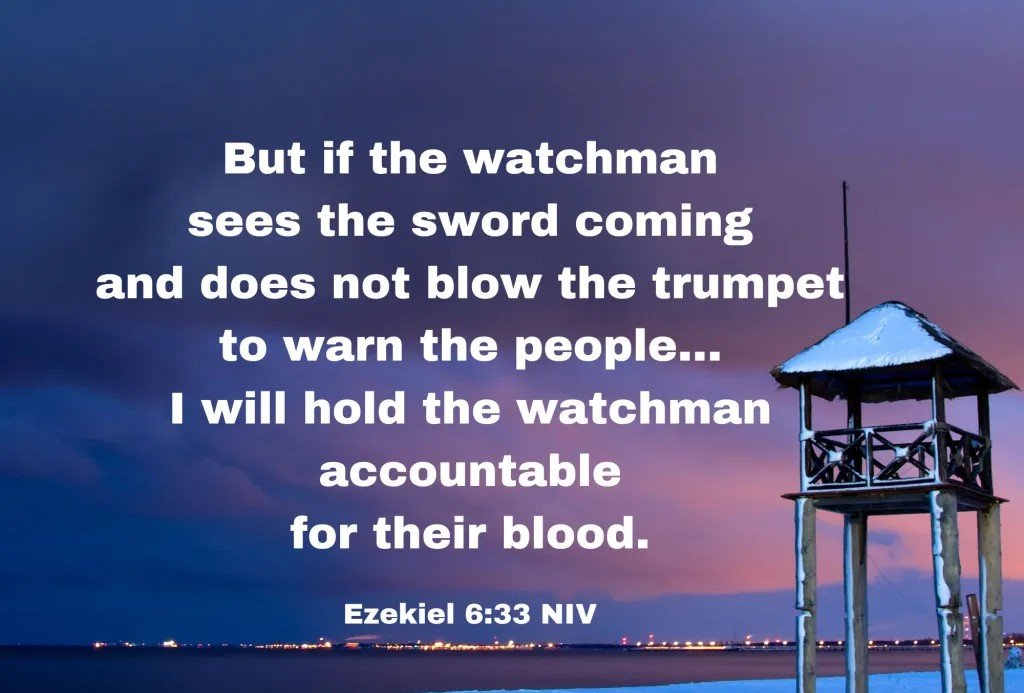 "But if the watchman sees the sword coming and does not blow the trumpet to warn the people and the sword comes and takes someone’s life, that person’s life will be taken because of their sin, but I will hold the watchman accountable for their blood."