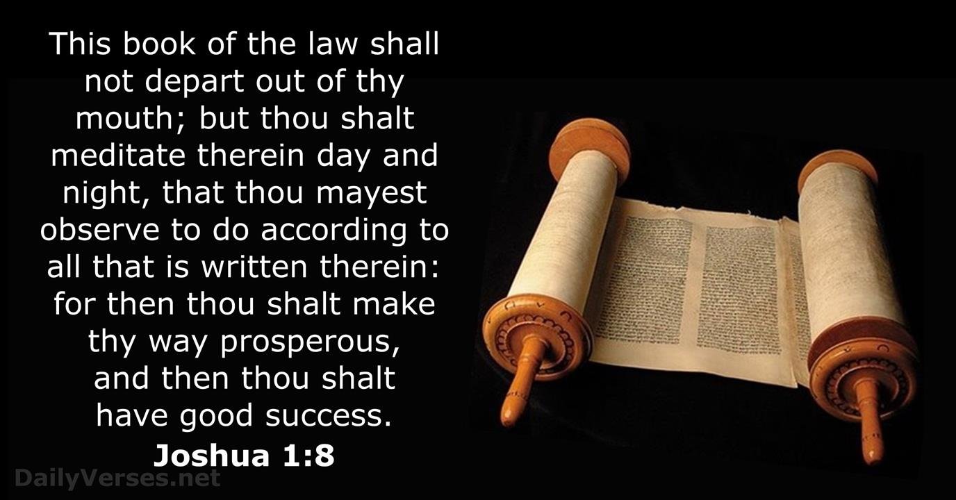 - Joshua 1:8 – "This Book of the Law shall not depart from your mouth, but you shall meditate on it day and night, that you may observe to do according to all that is written in it. For then you will make your way prosperous, and then you will have good success."