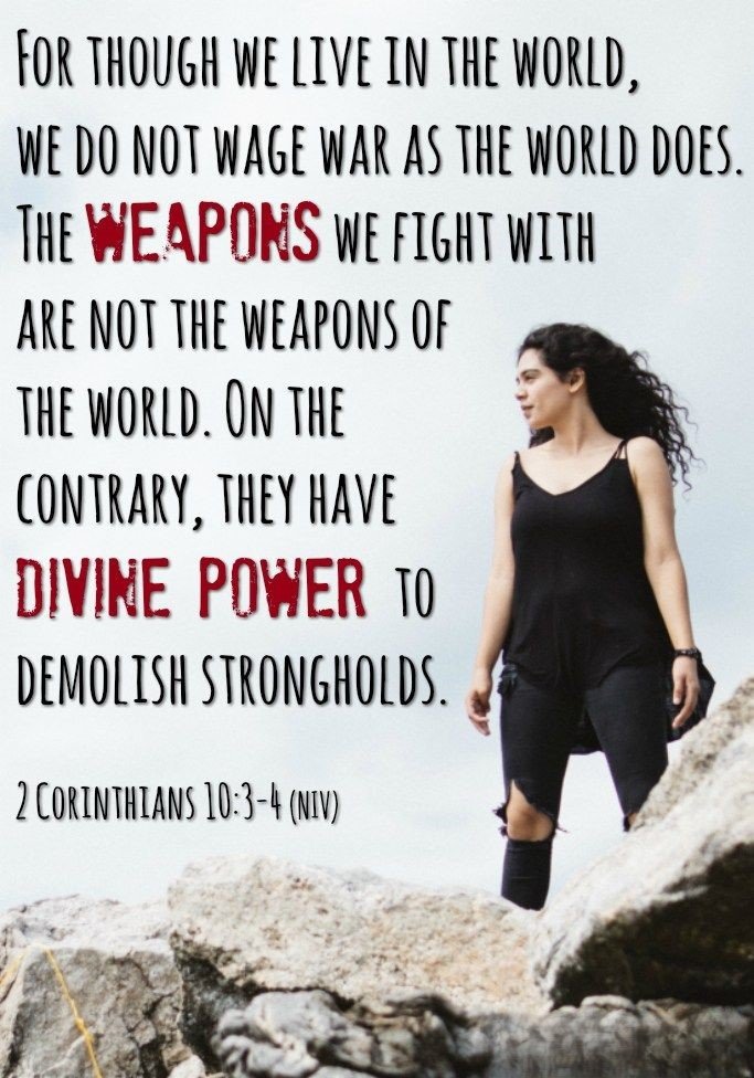 "For though we live in the world, we do not wage war as the world does. The weapons we fight with are not the weapons of the world. On the contrary, they have divine power to demolish strongholds." (2 Corinthians 10:3-4)