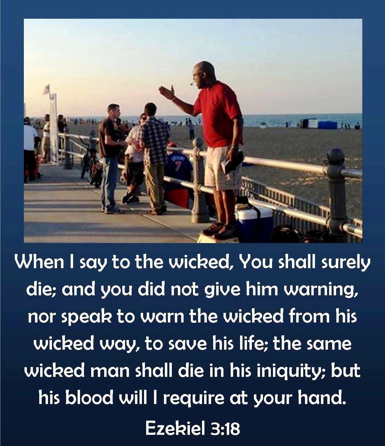 "When I say unto the wicked, Thou shalt surely die; and thou givest him not warning, nor speakest to warn the wicked from his wicked way, to save his life; the same wicked man shall die in his iniquity; but his blood will I require at thine hand." (Ezekiel 3:18)