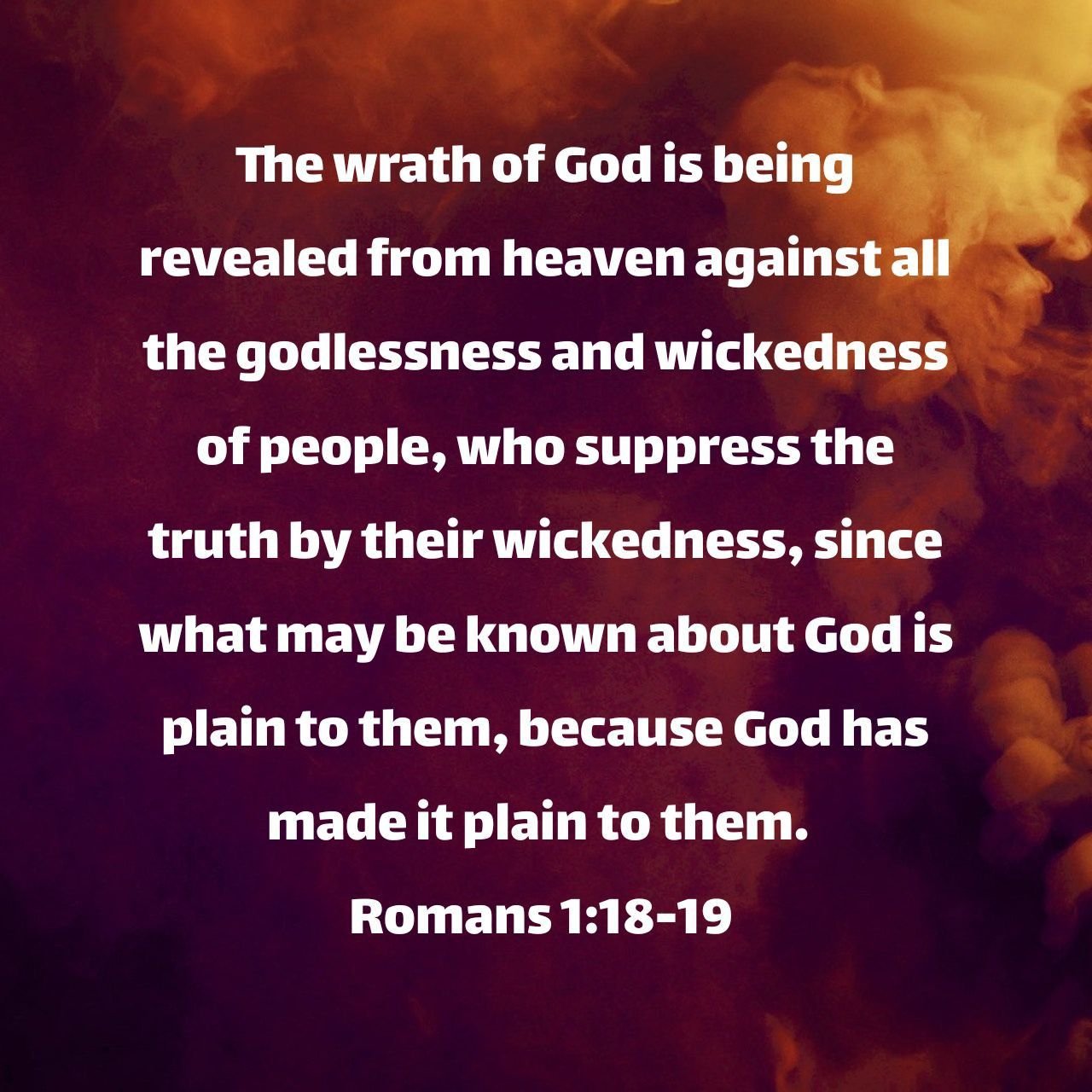 Romans 1:18-19 – “The wrath of God is being revealed from heaven against all the godlessness and wickedness of people who suppress the truth by their wickedness, since what may be known about God is plain to them, because God has made it plain to them.”
