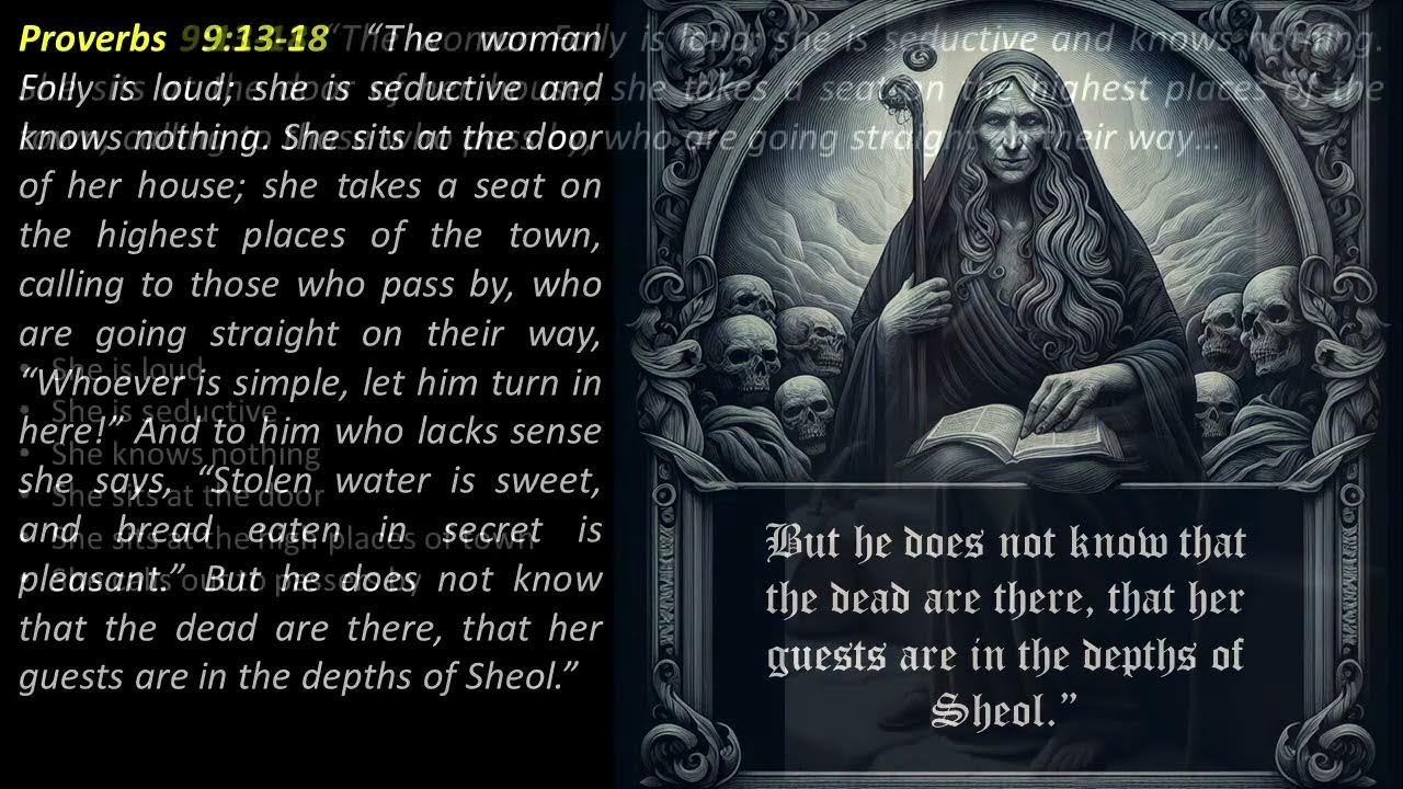 "The woman Folly is loud; she is seductive and knows nothing. She sits at the door of her house; she takes a seat on the highest places of the town, calling to those who pass by, who are going straight on their way, 'Whoever is simple, let him turn in here!' And to him who lacks sense she says, 'Stolen water is sweet, and bread eaten in secret is pleasant.' But he does not know that the dead are there, that her guests are in the depths of Sheol."