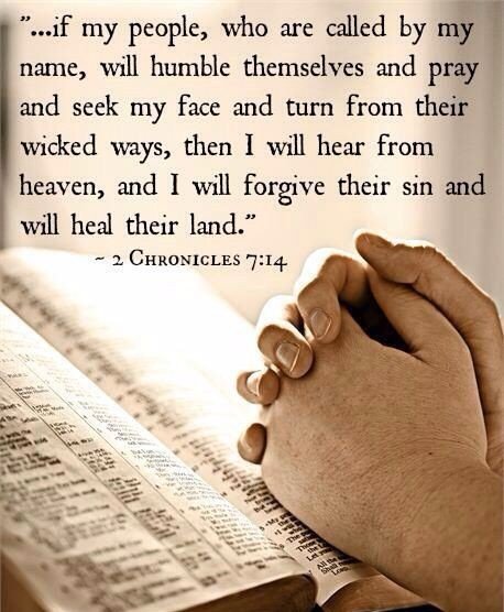 2 Chronicles 7:14 - "If my people, who are called by my name, will humble themselves and pray and seek my face and turn from their wicked ways, then I will hear from heaven, and I will forgive their sin and will heal their land."
