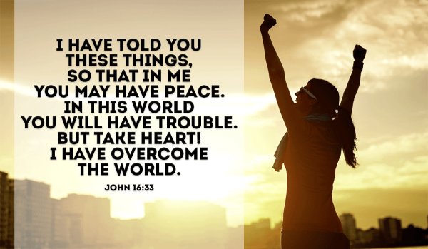 “I have told you these things, so that in Me you may have peace. In this world you will have trouble. But take heart! I have overcome the world.” (John 16:33, NIV)