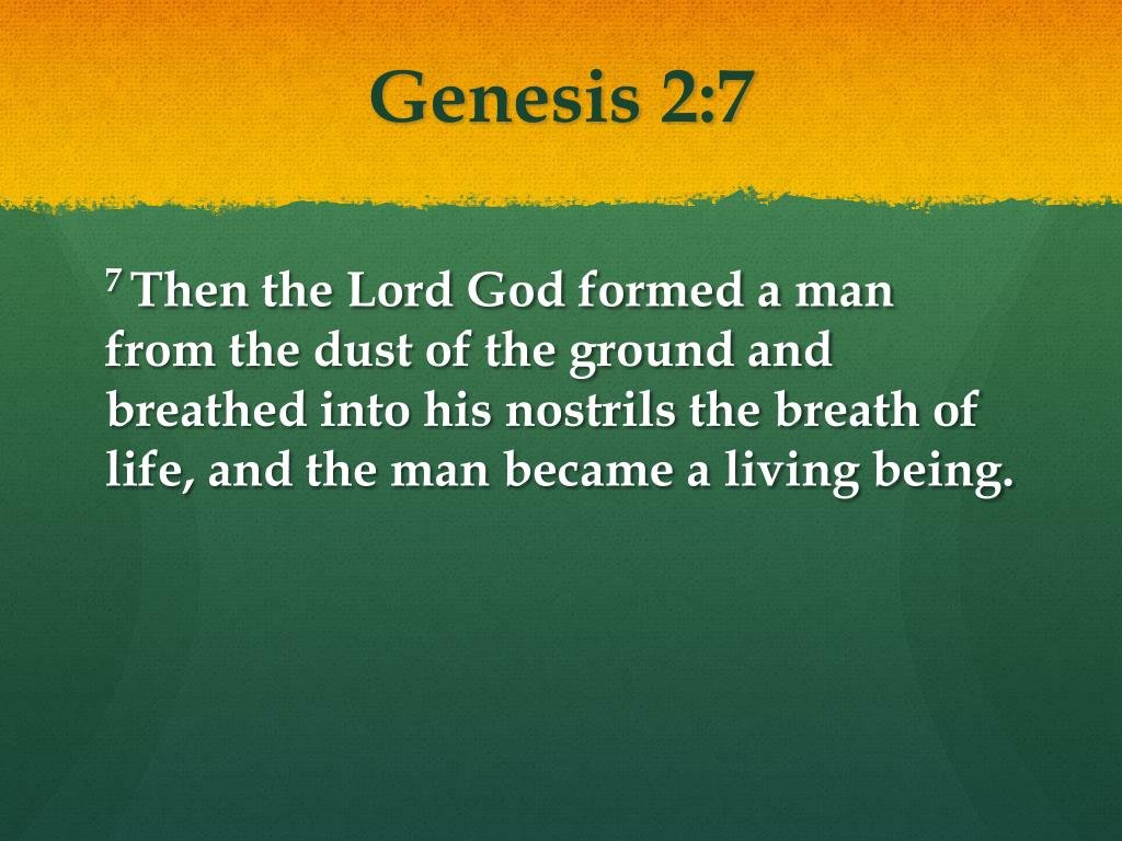 Genesis 2:7 (NIV): “Then the Lord God formed a man from the dust of the ground and breathed into his nostrils the breath of life, and the man became a living being.”