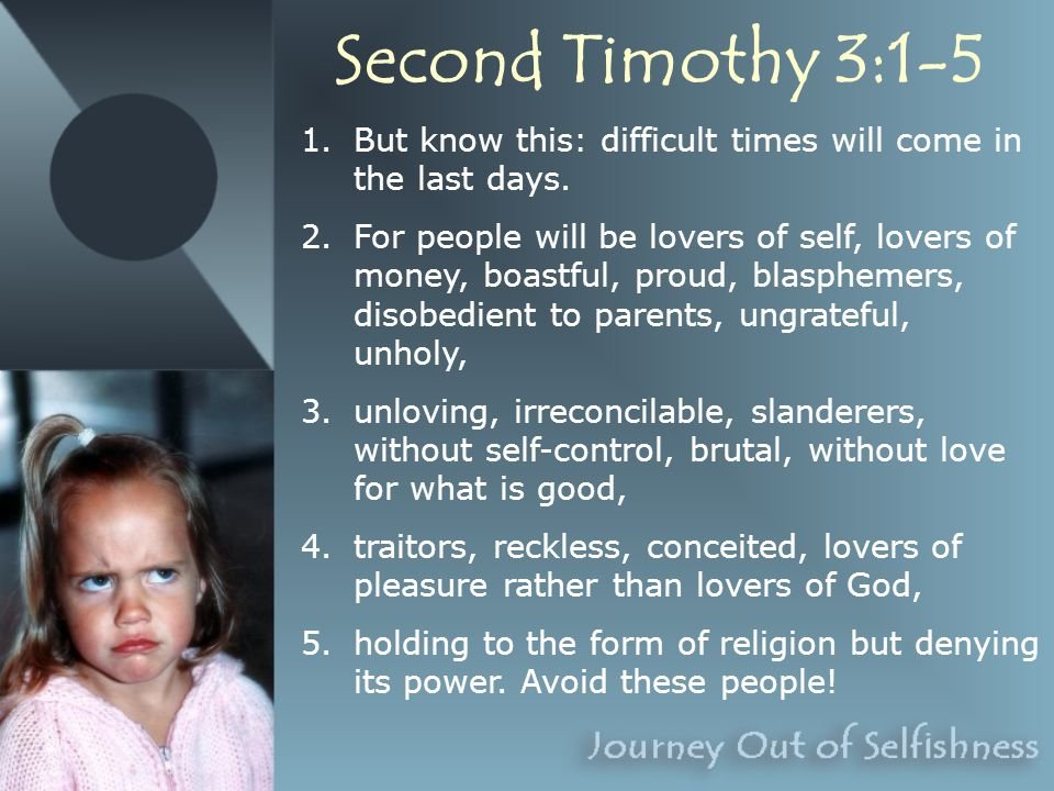 2 Timothy 3:2-4 - "People will be lovers of themselves, lovers of money, boastful, proud, abusive, disobedient to their parents, ungrateful, unholy, without love, unforgiving, slanderous, without self-control, brutal, not lovers of the good, treacherous, rash, conceited, lovers of pleasure rather than lovers of God."