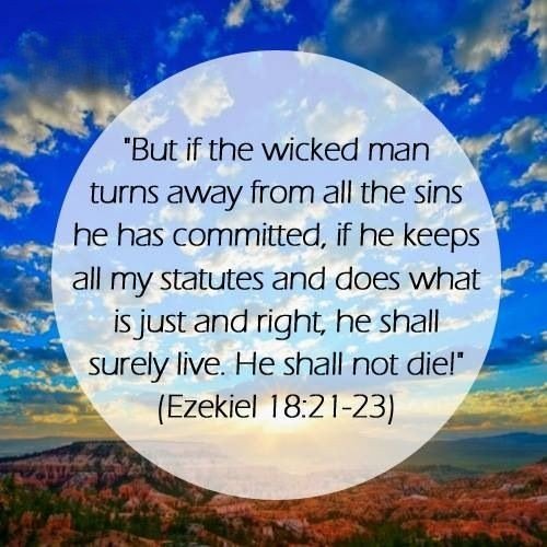 “But if a wicked person turns away from all the sins they have committed and keeps all my decrees and does what is just and right, that person will surely live; they will not die.” — Ezekiel 18:21