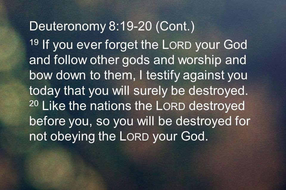 Deuteronomy 8:19: "If you ever forget the Lord your God and follow other gods and worship and bow down to them, I testify against you today that you will surely be destroyed."