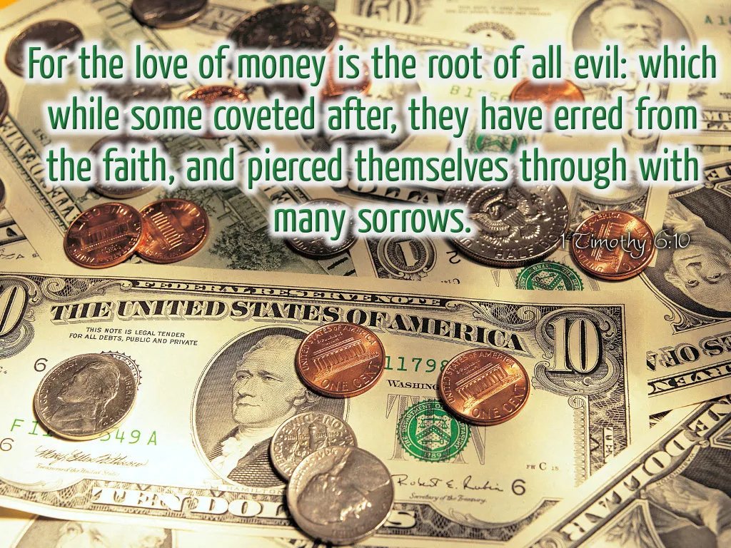 "For the love of money is the root of all evil: which while some coveted after, they have erred from the faith, and pierced themselves through with many sorrows." (1 Timothy 6:10, KJV)
