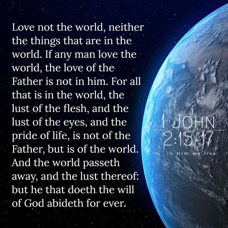 “Do not love the world or anything in the world. If anyone loves the world, love for the Father is not in them. For everything in the world—the lust of the flesh, the lust of the eyes, and the pride of life—comes not from the Father but from the world. The world and its desires pass away, but whoever does the will of God lives forever.”