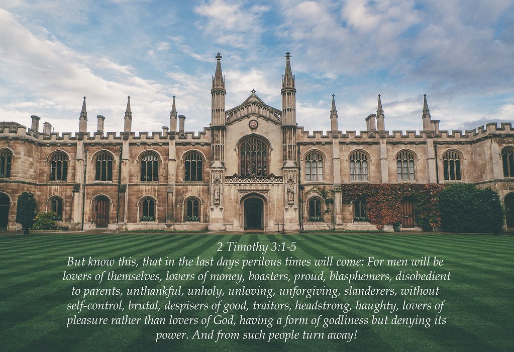 2 Timothy 3:2-5 “For men will be lovers of themselves, lovers of money, boastful, proud, abusive, disobedient to their parents, ungrateful, unholy, without love, unforgiving, slanderous, without self-control, brutal, not lovers of the good, treacherous, rash, conceited, lovers of pleasure rather than lovers of God—having a form of godliness but denying its power. Have nothing to do with such people.”