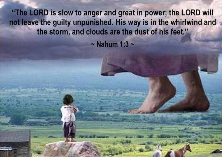 "The Lord is slow to anger but great in power; the Lord will not leave the guilty unpunished. His way is in the whirlwind and the storm, and clouds are the dust of his feet."