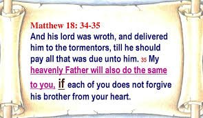 Scripture: Matthew 18:34-35 - "In anger his master handed him over to the jailers to be tortured, until he should pay back all he owed. This is how my heavenly Father will treat each of you unless you forgive your brother or sister from your heart."