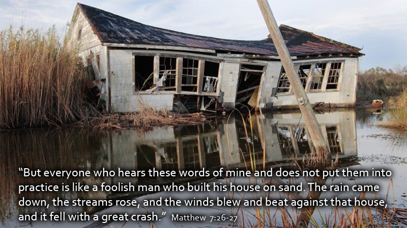 "But everyone who hears these sayings of Mine, and does not do them, will be like a foolish man who built his house on the sand: and the rain descended, the floods came, and the winds blew and beat on that house; and it fell. And great was its fall." (Matthew 7:26-27)