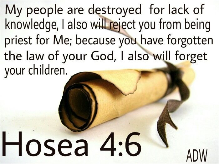 Hosea 4:6 "My people are destroyed for lack of knowledge: because thou hast rejected knowledge, I will also reject thee, that thou shalt be no priest to me: seeing thou hast forgotten the law of thy God, I will also forget thy children."