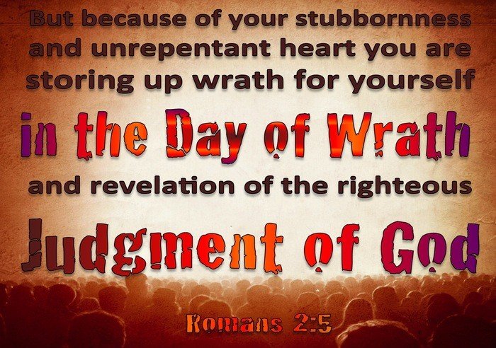 Romans 2:5 - "But because of your stubbornness and your unrepentant heart, you are storing up wrath against yourself for the day of God's wrath, when his righteous judgment will be revealed."