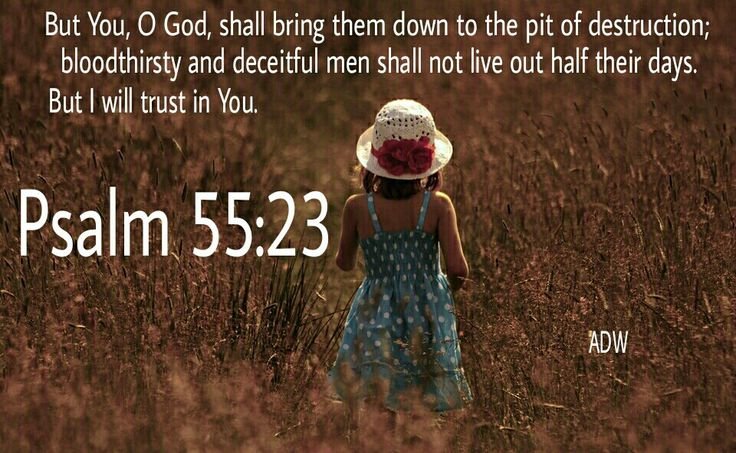 Key Scripture: “The Lord will bring them down to the pit of destruction; the bloodthirsty and deceitful will not live out half their days. But I will trust in you.” – Psalm 55:23