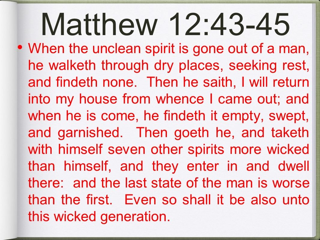 **"When the unclean spirit is gone out of a man, he walketh through dry places, seeking rest, and findeth none. Then he saith, I will return into my house from whence I came out; and when he is come, he findeth it empty, swept, and garnished. Then goeth he, and taketh with himself seven other spirits more wicked than himself, and they enter in and dwell there: and the last state of that man is worse than the first." (Matthew 12:43-45, KJV)